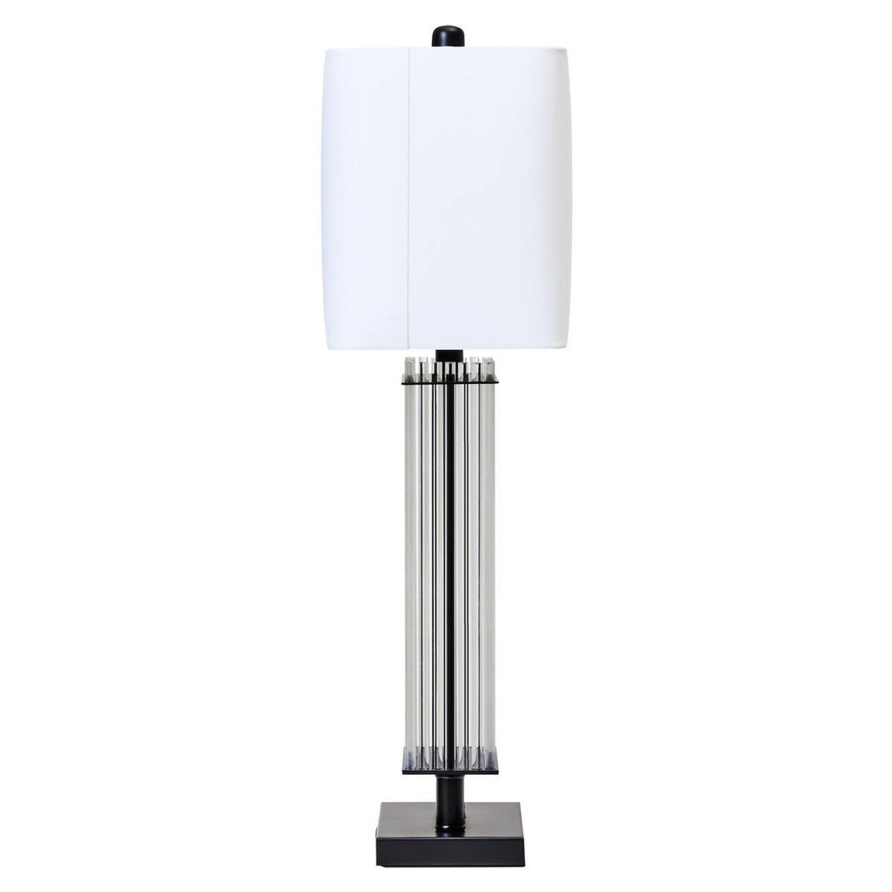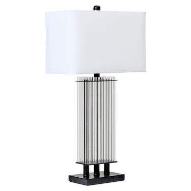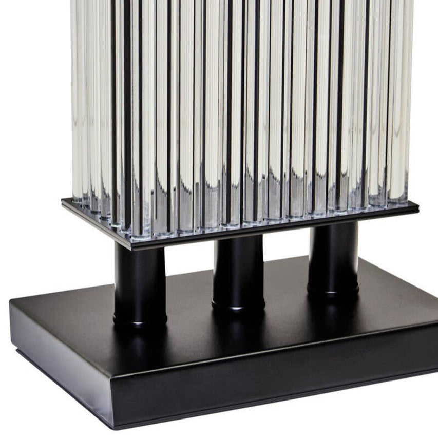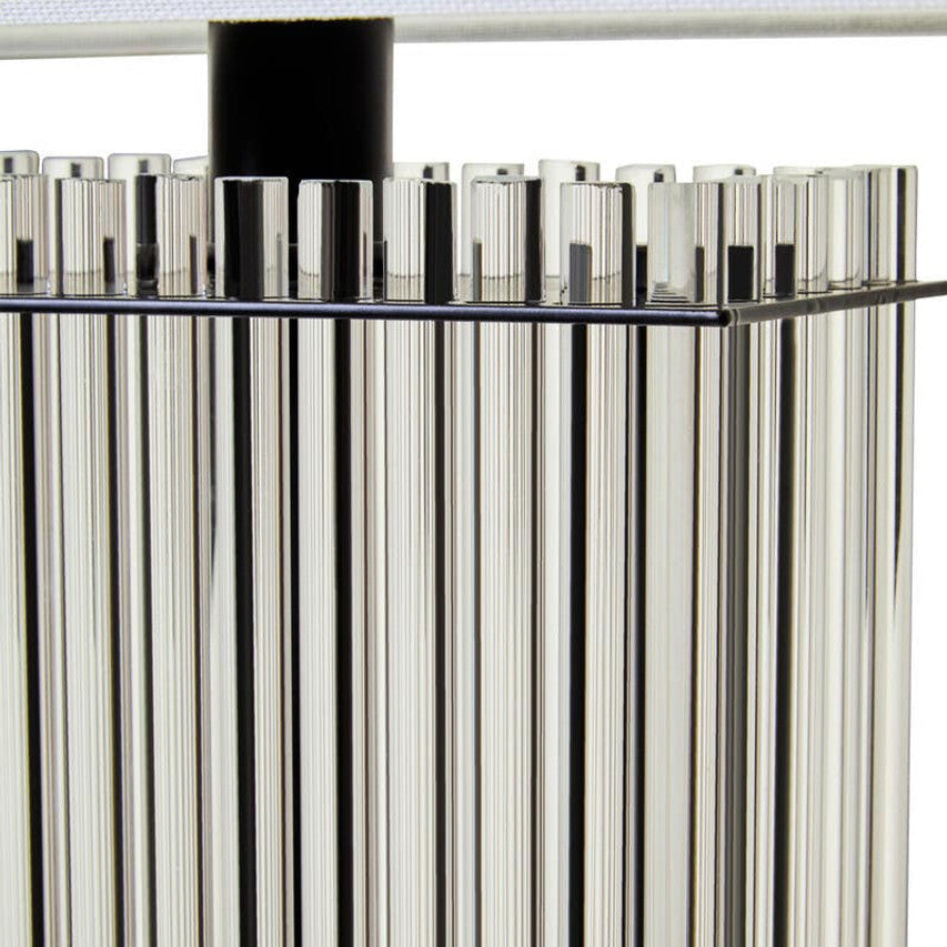 Bring boutique hotel elegance home with the Enola Table Lamp, a striking blend of contrast and clarity. Featuring vertical ribbed glass rods rising from a sleek matte black base, this piece exudes timeless sophistication. Topped with an ivory fabric shade and finished with a decorative black finial, Enola delivers soft ambient lighting with high-end design appeal.