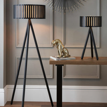 Rabanne Slatted Black Wood Tripod Floor Lamp – Contemporary Statement Lighting with Elegant Diffused Glow