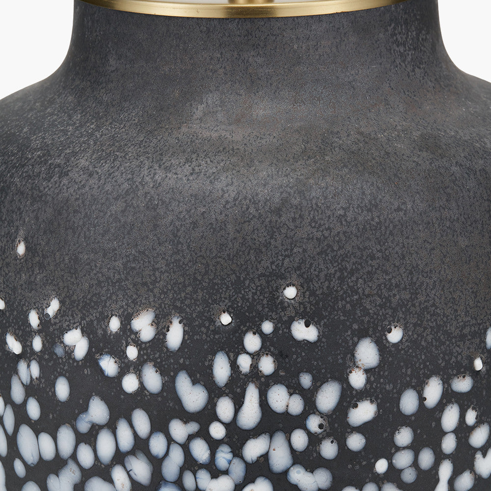 • Hand-blown black glass base with intrinsic white speckled detailing.