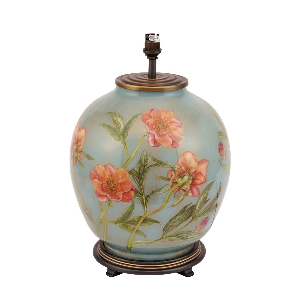 The Coral Peony design is pictured on a soft blue background with a coral pink flower and gold accenting to give the design depth. The glass is then completed with an antique brass finish base and top and a B22 light bulb holder in the same finish.